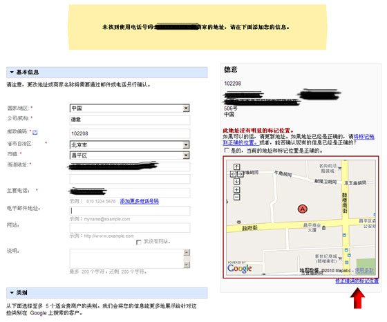 在下面這個(gè)頁(yè)面中如實(shí)地填寫企業(yè)的相關(guān)資料,并在右側(cè)的預(yù)覽中檢查自己是否有大馬哈,填寫的信息是否正確,如果發(fā)現(xiàn)位置出現(xiàn)錯(cuò)誤的話,請(qǐng)點(diǎn)擊紅色箭頭處的“修正錯(cuò)誤的標(biāo)記位置”鏈接進(jìn)行修正。記得勾選右側(cè)預(yù)覽中“是的,當(dāng)前的地址和標(biāo)記位置是正確的。”