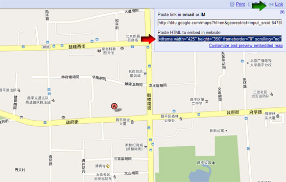 彈出的新網(wǎng)頁(yè)會(huì)顯示屬于自己企業(yè)的地圖了,這個(gè)時(shí)候證明你已經(jīng)大獲全勝了,別急,再點(diǎn)擊網(wǎng)頁(yè)右上角“Link”鏈接(下圖綠色箭頭處),彈出可以為網(wǎng)頁(yè)嵌入代碼(下圖紅色箭頭處),拷貝框中的代碼到相關(guān)的企業(yè)網(wǎng)站頁(yè)面即完成了,建議放在聯(lián)系主要的網(wǎng)頁(yè)中。