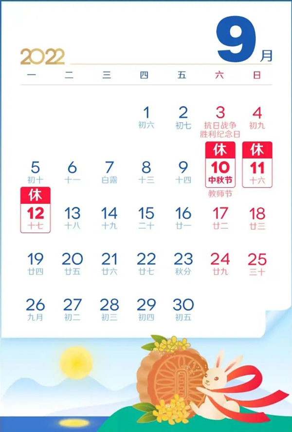 根據(jù)《國務(wù)院辦公廳關(guān)于2022年部分節(jié)假日安排的通知》精神,2022年中秋節(jié)放假安排如下:9月10日至9月12日放假,共3天。